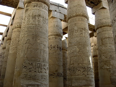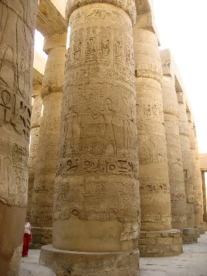 大列柱室、柱にはラムセス2世と神々のストリーがぎっしり。二百数十人の