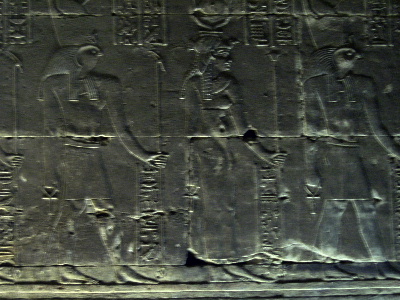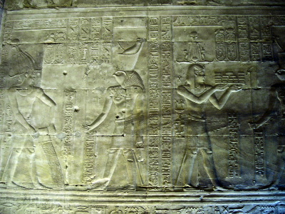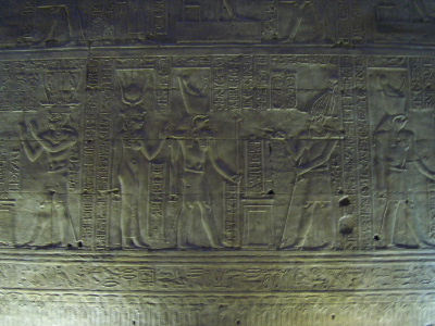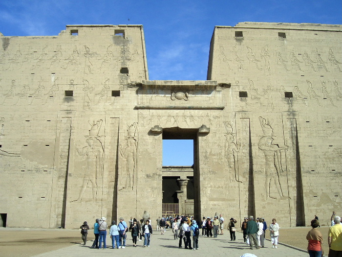 巨大な城門には、ファラオが神に貢物を捧げるレリーフが一面に彫られています
