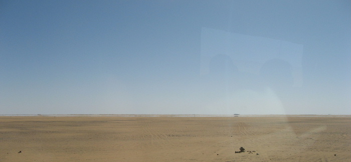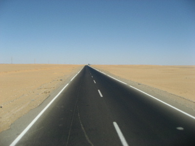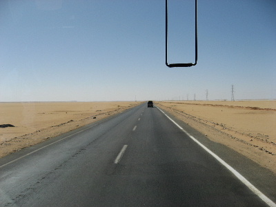 途中に検問所がある以外は、何もありません。黒いアスファルトと砂原