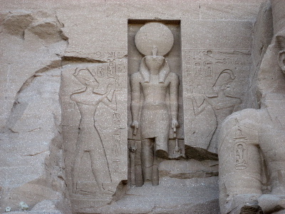 世界の神)・アメン神、そしてラムセス王、ラー太陽神が、同じ大きさで、並んで