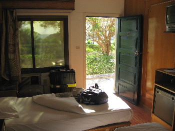 部屋の中から外を見ると、木々がいっぱい。ガイドさんから、ヤモリは怖く