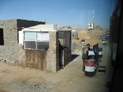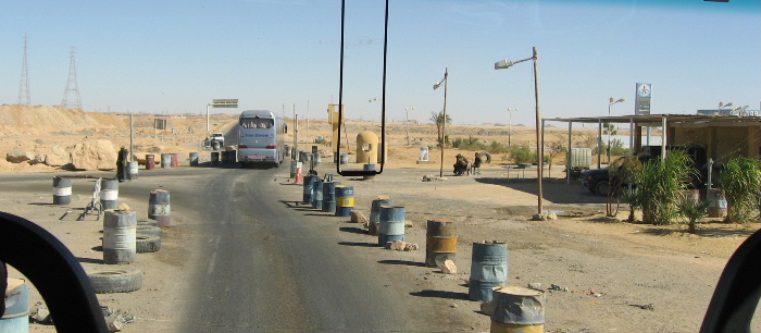 この検問所は、砂の入ったドラム缶で、通行道路の規制がされています.