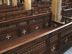 左右に二つあって、アーチ型の造りです。内部の椅子です。厳格な 雰囲気が