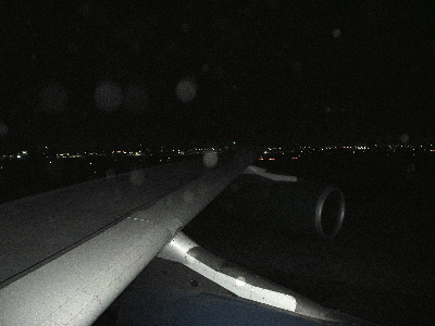 6時発が遅れて搭乗、もう辺りは暗闇につつまれています。翼の後ろ付近