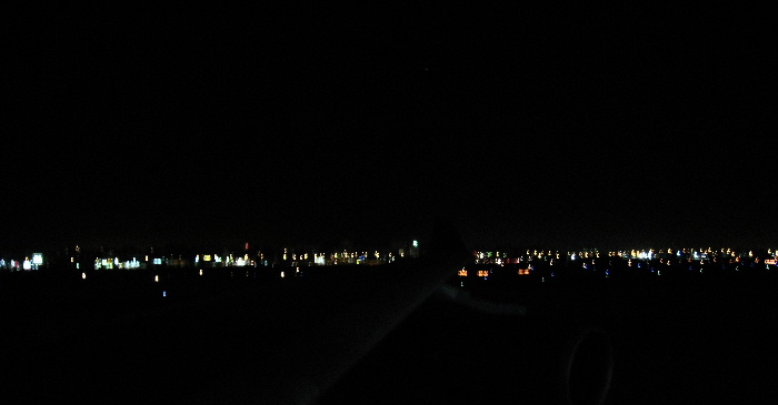 回りに灯りの少ない飛行場を後に、偏西風に乗って、11時間半のフライト