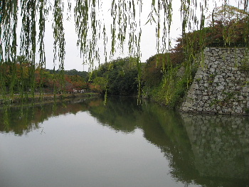 お濠は 幅は広い所で34.5m 平均20m。深さは平均2.7mぐらい。柳の枝越しに見る