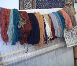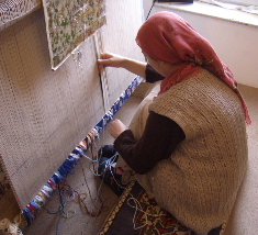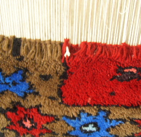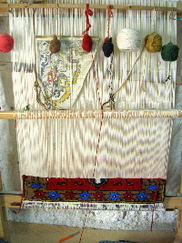 奥さんの織りかけの絨毯、絵図に合わせ、1本づつ結んで行く