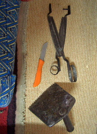 右端は、絨毯の毛の長さを揃えて切る鋏とナイフ、編目押さえ