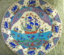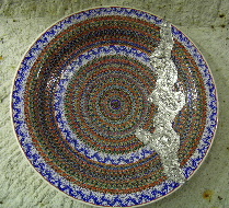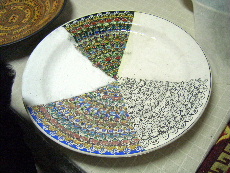 上げられました、飾り皿の製作工程の説明、(中央写真)無地のお皿に線