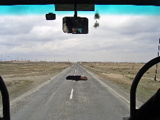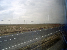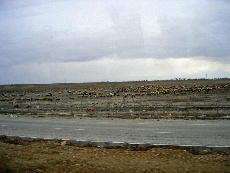 なおも、真直ぐなシルクロードは続く、右端写真、たくさんの羊が