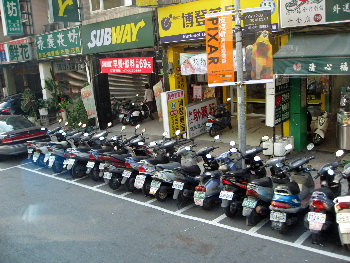 道路わきには、バイクの駐車スペースが、どこここにもぎっしり。.
