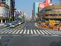 主要幹線は道幅も広く、四つ角にはコンビニがある。.