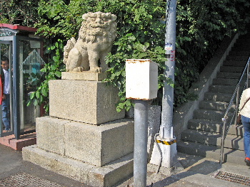 広い石段の左右には、日本とは随分表情の違う狛犬が鎮座。.