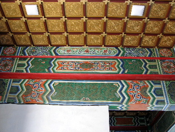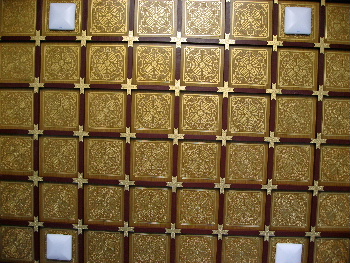 伽藍の圧倒される彩色に、参拝者も心が素直になる。天井の装飾も見事なものだ。.