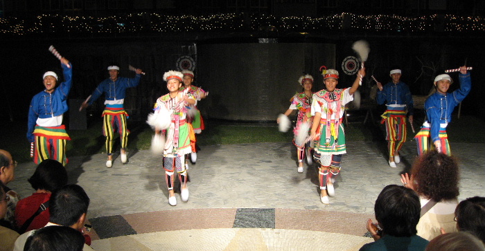 台東のホテルの中庭にあるステージで、原住民アミ族の若者の踊りが披露された。.