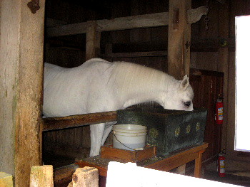 厩の中には、ニュージランド首相から献進された白馬が、お食事中です。.