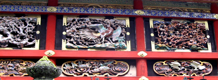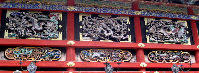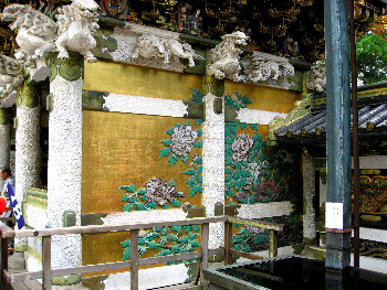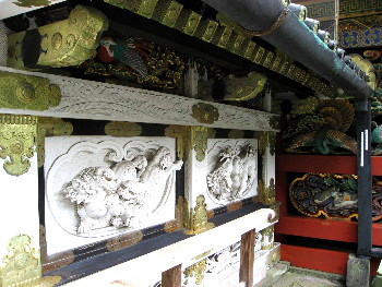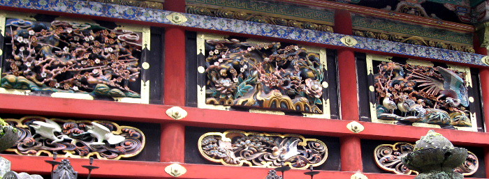 左右の外壁に日本最大の花鳥の彫刻が飾られ、極彩色の透かし彫りの、国宝「廻廊」.
