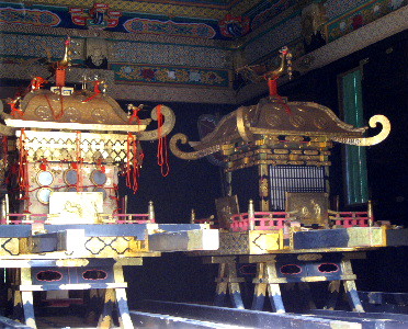 扉や透かし彫りの壁。舎の中に鎮座する、三基のお神輿 .