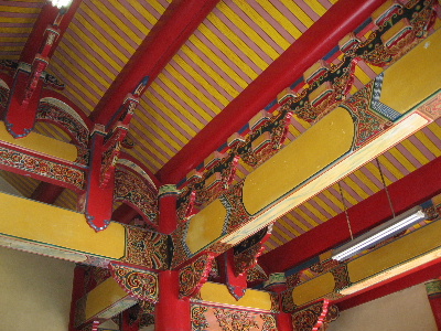 懐かしい、赤と黄色の配色が施された天井。供物台には、ぎっしりのお菓子や果物。.