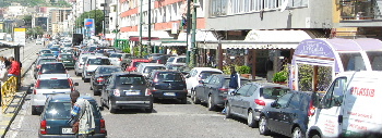 歩道寄りには、一列 駐車車両がびっしり並ぶ。駐車場が無く、道路が