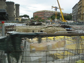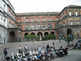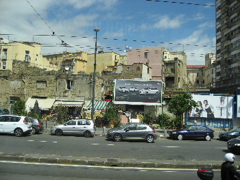 ナポリの歴史地区は、歴史のある建物が並び、地面は発掘現場でガタガタ