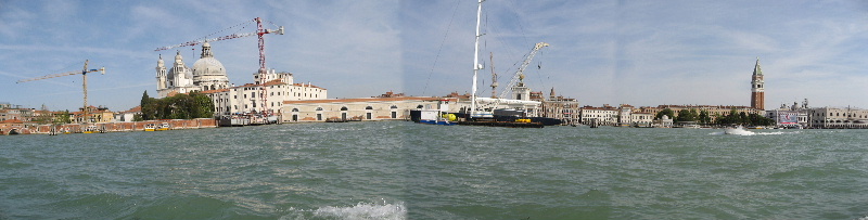 大型のクレーンがあちこちで動いている。右端には、これから行く、サンマルコ広場の鐘楼が見える.