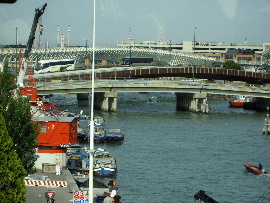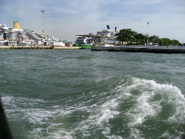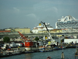 港に着いた。立体交差にモノレール。インフラは進んでいる。向こうには、大型客船が