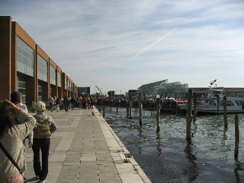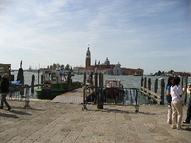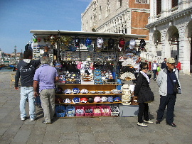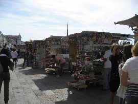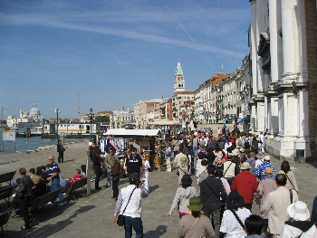 お面や小物を売る、露天商がずらっと並ぶ。船着場の向いに浮かぶ島には、サン・ジョルジョ