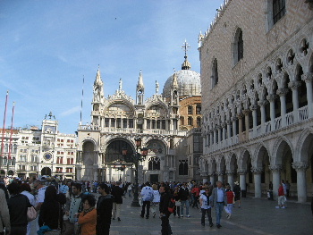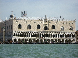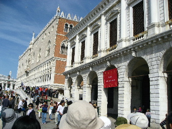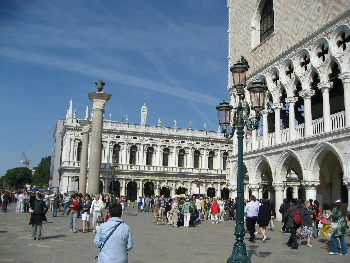 左の写真の2本の石柱は、宮殿の角を左に曲がると、奥にサン・マルコ広場があり