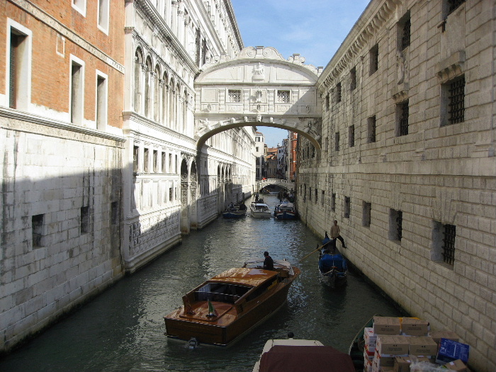 宮殿と運河を隔てて石牢があり、2階部分に、渡り廊下がついている。「ため息の橋」と呼ばれ