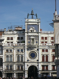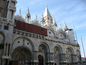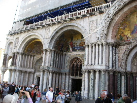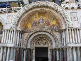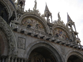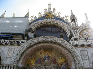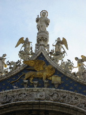 正面中央のドームの上には、ベネチアの守護聖人、聖マルコの像が。その下には翼のある