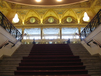 玄関からロビーに上がる階段。ロビーにはレセプションのテーブルがびっしり