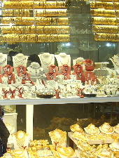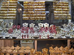 何軒も連なる貴金属店の店先、まあこれだけあると、ジャンボ宝くじ