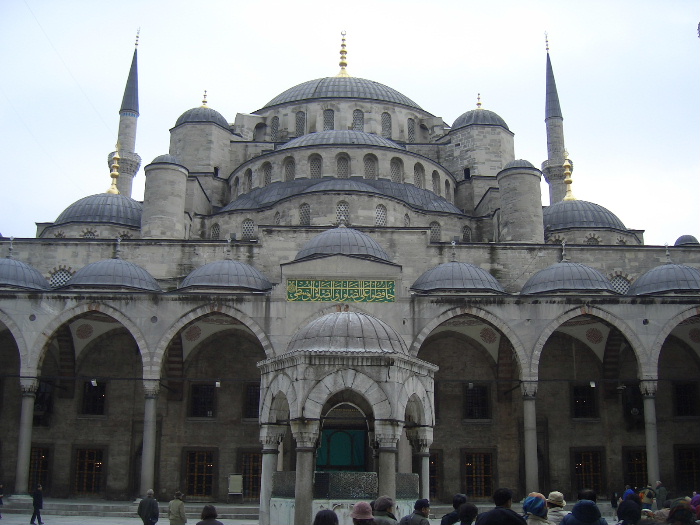 ブルーモスクの中庭で説明を聞きながら、見上げる、なんと大きい
