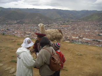 アルパカを連れたおばさんが、物売りしいる、もちろん写真をとると有料?