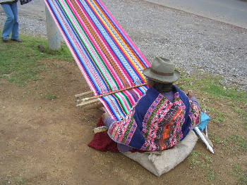 おばあさんが、アルパカで布地を織っている、色合いがとても素敵! .