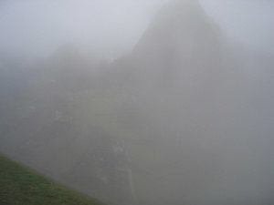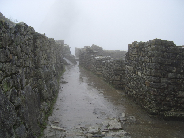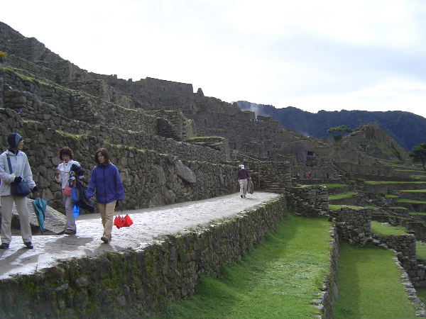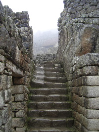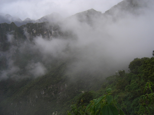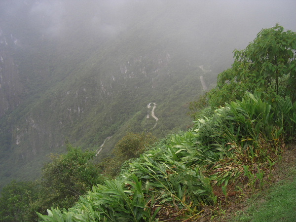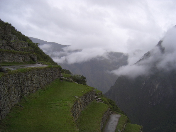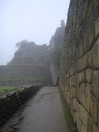 遺跡への道はゆっくりした登り、石段が続く、我々は雲の上にいる事に気づく
