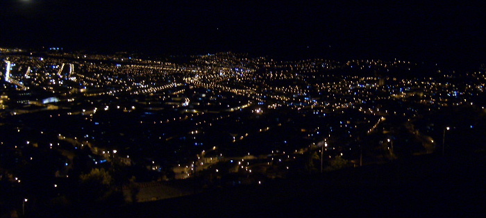 ホテルへ帰る途中、高台からクスコの夜景を眺望する、ネオンの