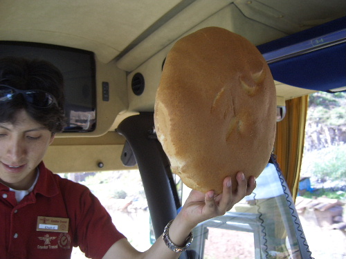 これは 麦ととうもろこしで出来たパン、ガイドの青年がバスを止めて買いに