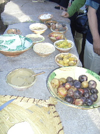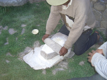 屋外のキッチン(竈)と石の調理台、右は粉引きを実演して見せていただいた