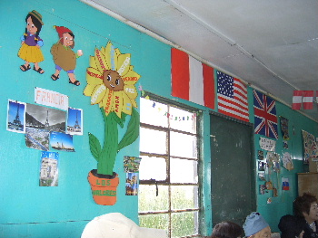 学校の前には、大きなスピーカー、室内の壁には絵や貼り紙が