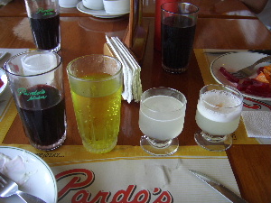 飲み物を並べてみた、左から「紫とうもろこし」のジュース・かの有名な