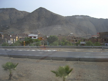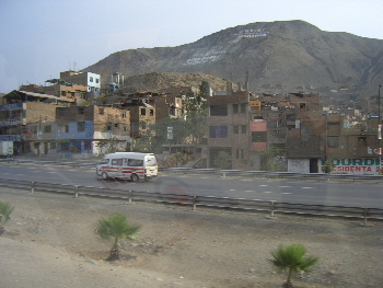 窓の景色は、リマ市街。朝の通勤ラッシュで、車が渋滞している。 .