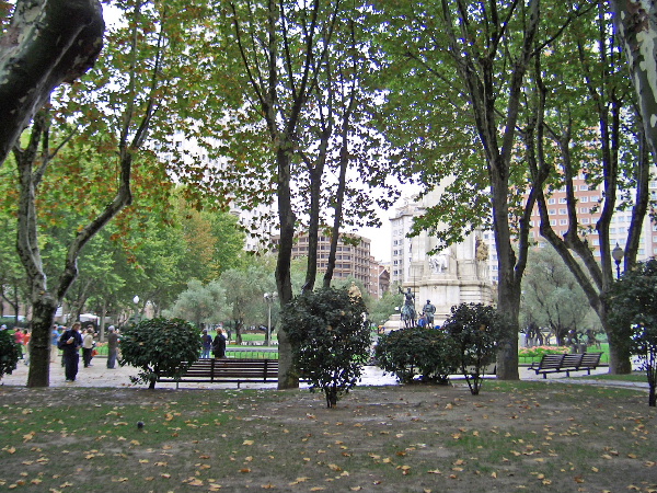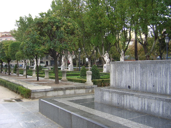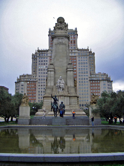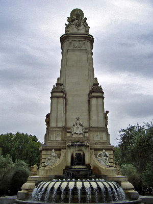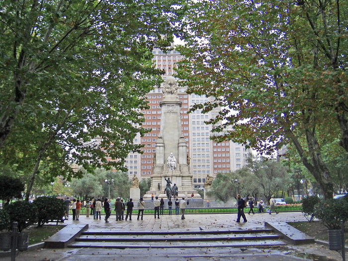 記念碑の白い坐像は「ドン・キ・ホーテ」の作家セルバンテス