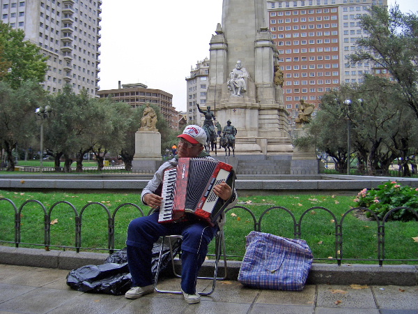 そこには、ドン・キホーテと従者の銅像があり、それを背景にアコーディオン