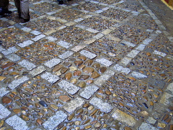 地面はツートンカラーの小石の石畳とタイルの組み合わせ