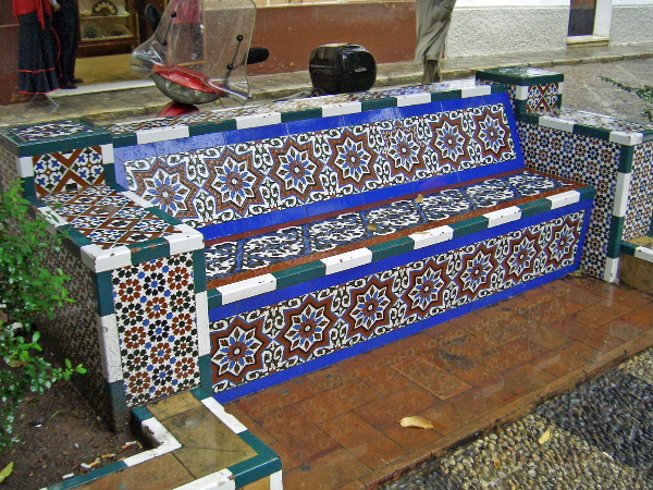 公園の中の、絵タイルで出来たベンチ。この様なベンチに座って