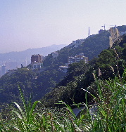 橋を越えると、ランタオ島に入る、道路の左側の山の左にミッキーがいる