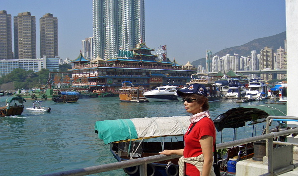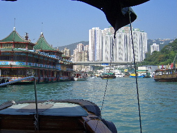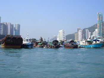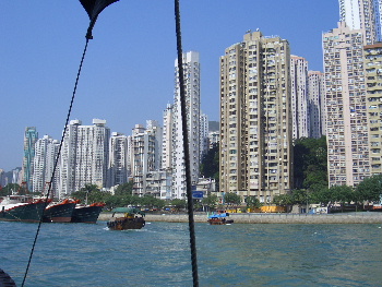 岸辺のすぐ傍に、この高層ビル群!湾内には、水上生活者が???