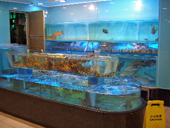 エレベーターを降りると、そこには生簀があった、客席はここもガラ〜ン